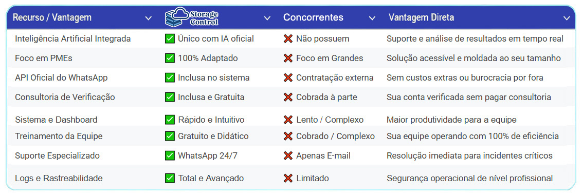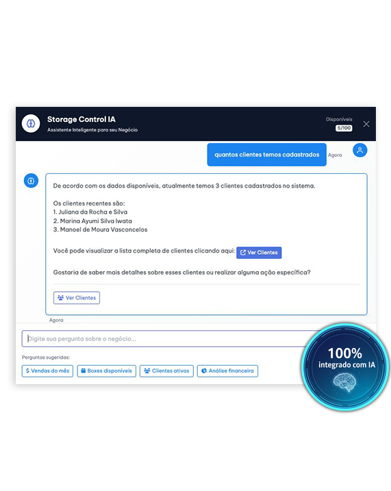 O StorageControl é o único que utiliza Inteligência Artificial para orientar gestores e colaboradores em tempo real. A IA analisa os dados inseridos, gera insights sobre a ocupação e ajuda a equipe a evitar erros de preenchimento, tornando a operação muito mais precisa e inteligente do que sistemas comuns.